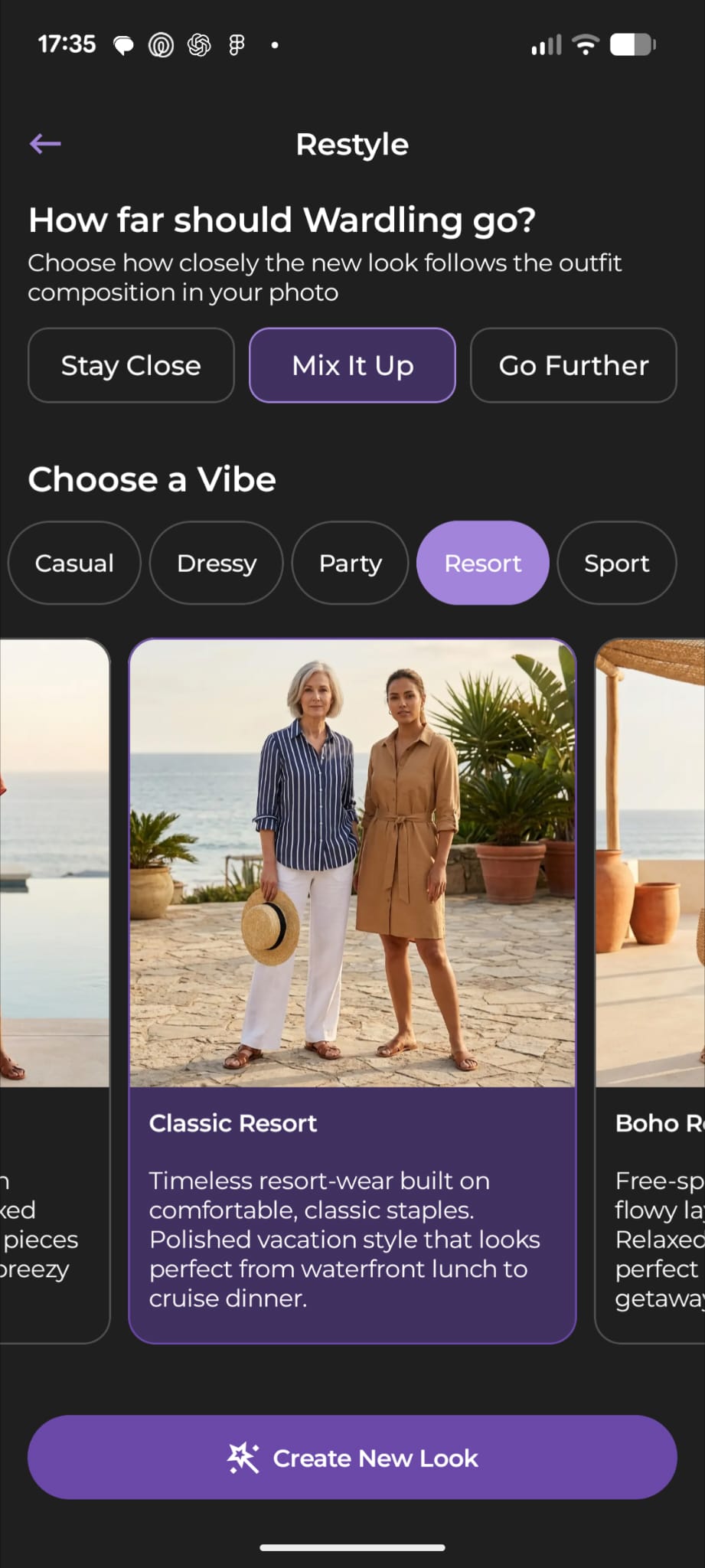 This new Restyle control lets you tell Wardling how closely the new look should follow the outfit in your photo. You can choose Stay Close when you want to preserve the core structure of the look. You can choose Mix It Up when you want more freedom to shift the composition. Or you can choose Go Further when you want Wardling to explore more boldly and bring you a wider range of ideas.